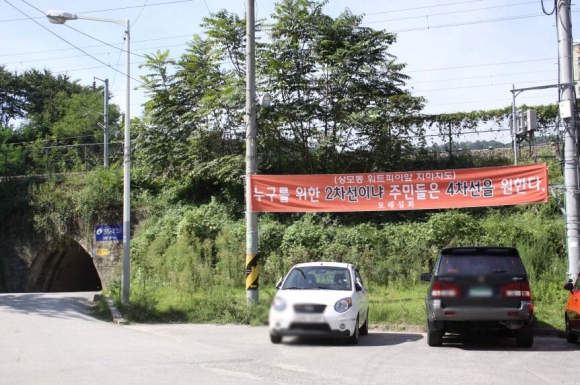 이러한 사실이 알려지자, 주민들은 “4차선도 비좁은데 2차선이 웬말이냐”는 현수막을 내거는 등 반발하고 있다.