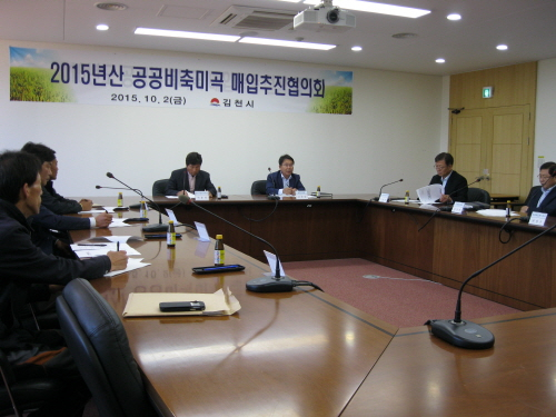 회의에는 쌀전업농 연합회, 농업경영인 연합회, 쌀연구회와 농협, 미곡종합처리장, 농산물 품질관리원 김천사무소 및 시 관계자 등이 참석했다. 시의 2015년산 공공비축미곡 매입물량은 13만2천430포대(40kg)이며, 10월 19일부터 12월4일까지 산물벼를 매입한다. 매입품종은 일품벼와 운광벼로 우선 지급금은 1등급 40kg 포대벼 기준 5만2천원이다. 포대벼는 수분함량 13.0~15.0%인 경우 매입가능하며, 13.0%미만일 경우 2등급을 낮춰 합격처리할 수 있다.