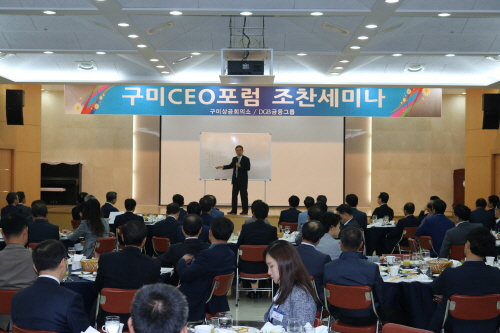 구미상공회의소(회장 류한규)가 DGB금융그룹(회장 박인규)과 공동으로 22일2층 대강당에서 제21회 구미CEO포럼 조찬세미나를 가졌다.