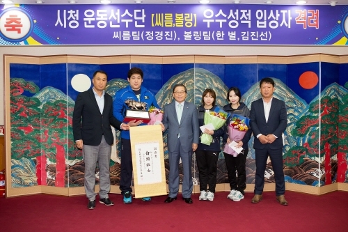 남유진 시장은‘2015 추석장사씨름대회’에서 백두장사에 등극한 정경진(28세)선수와 전국단체대항 볼링대회에서 개인전 우승을 차지한 한별(23세)선수와 준우승에 빛나는 김진선(22세)선수에게 “언제나 도전하는 정신으로 더욱더 기량을 연마해 시의 영예를 빛내 달라”고 격려했다.