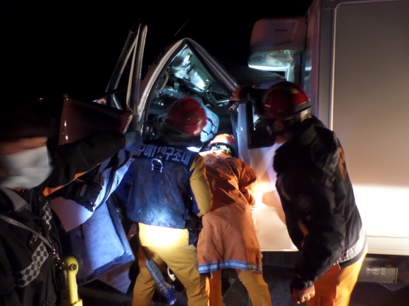 신고를 받고 출동한 구미소방서 구조대는 1톤 탑차 운전석에 끼어 있는 박모씨를 구조해 인근병원으로 이송했다.