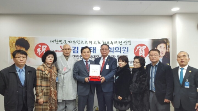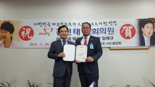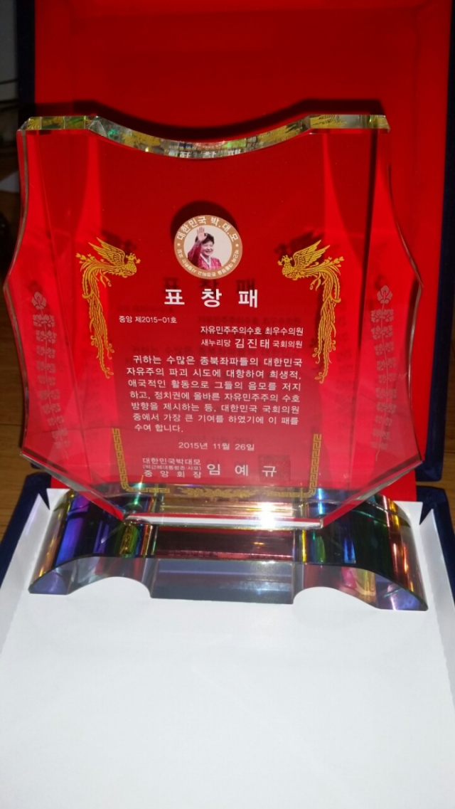 박근혜 대통령을 사랑하고 존경하는 모임인‘박대모’(회장 임예규)가 자유민주주의 수호를 위해 희생한 자들을 격려하기 위해‘대한민국 자유민주주의 수호상’을 제정하고, 제1호 수상자로 김진태 새누리당 의원을 대한민국 자유민주주의 수호 최우수 국회의원으로 선정했다.