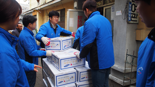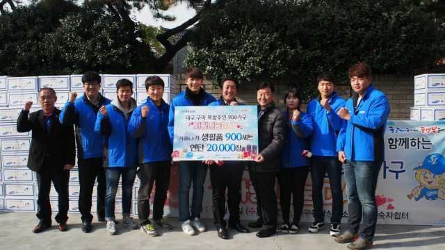 삼성전자 스마트시티(공장장 심원환)가 대구 쪽방상담소(이사장 김영달), 삼성라이온즈(대표이사 김동환 사장)와 합동으로 9일 대구시와 구미시 쪽방 주민 9백 세대를 찾아 쌀과 라면, 통조림, 스팸, 장조림등 생필품 9백 세트와 연탄 2만장을 전달했다.