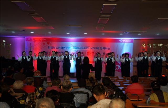 협약 체결 후 경북환경연수원 에코그린합창단(지휘자 최은진)은 요양병원 대강당에 모인 200여명의 환우 및 임직원들에게 자연사랑 이웃사랑을 솔선ㆍ실천하기 위한 아름다운 재능기부 공연을 펼쳤다.
