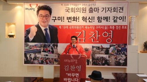 김찬영(33세)전 새누리당 보수혁신 특별 위원장 청년특보가 14일 구미시청 열린나래에서 기자회견을 갖고 내년 4월 실시되는 제20대 총선 구미시 을지구 새누리당 후보 출마를 공식 선언했다.