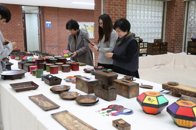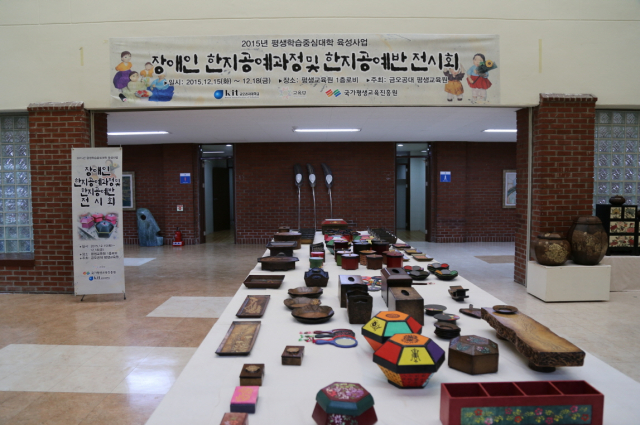중중장애인들이 금오공대 평생교육원에서 실시하는 프로그램을 통해 익힌 공예작품을 모아 연 전시회는 평생교육원 사회교육대학과정의 한지공예반과 공동으로 진행됐다.