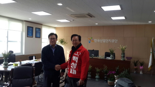 새누리당 백성태 구미갑 예비후보가 13일 한국산업 관리공단 대구경북 지역본부 권기용 본부장을 만나 청년 일자리 창출을 비롯한 주요 현안에 대해 의견을 교환했다.