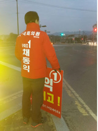 새누리당 채동익 구미갑 예비후보가 28일 새벽, 봉곡동 봉곡 네거리에서 출퇴근길 시민들과 마음과 마음을 주고받는 ‘맘맘 민심 투어’에 나섰다.