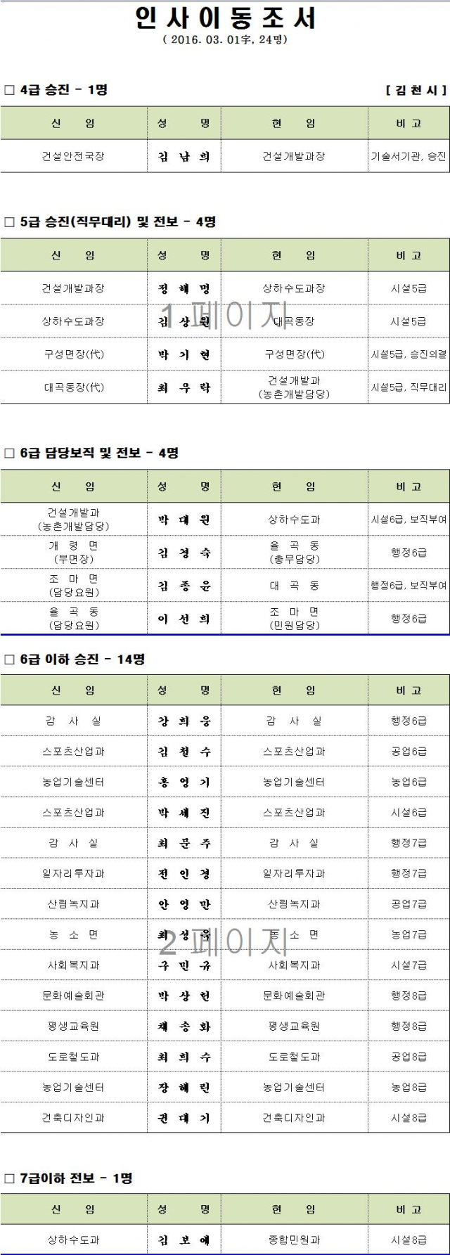 김천시가 24일자로 승진 4급 1명, 5급 1명, 6급 이하 14명 등 24명에 대한 수시인사 결과를 다음과 같이 발표했다.