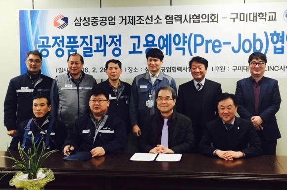 구미대학교(총장 정창주)는 26일 삼성중공업 거제조선소 협력사 협의회실에서 협력사 소속 기업들과 취업을 보장하는 고용예약형 산학협약을 체결했다.