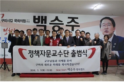 새누리당 구미갑 경선후보로 결정된 백승주 예비후보가 5일, 선거사무소에서 금오공대, 구미대, 경운대 등 지역대학 소속 16명의 교수가 참여한 가운데 정책자문교수단 출범식을 가졌다고 밝혔다.