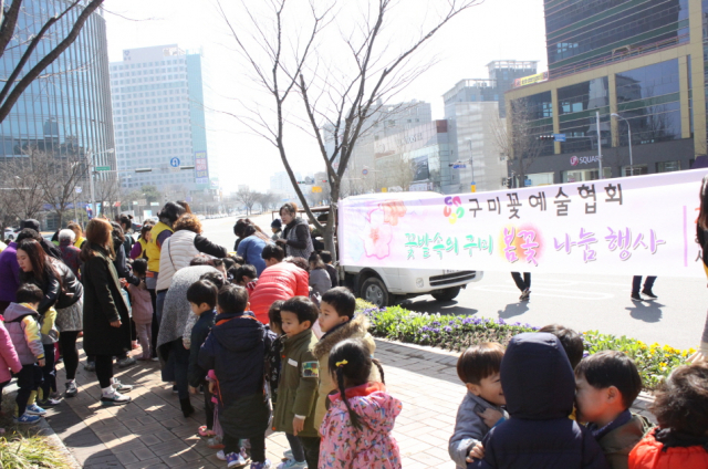 이날 구미꽃예술협회 회원 20여명은 비올라, 베이지, 꽃잔디, 금잔화, 패래이 등 꽃묘 3천본을 관내 어린이집 및 유치원 원생들과 지나가는 시민들에게 무료로 나눠줬다.