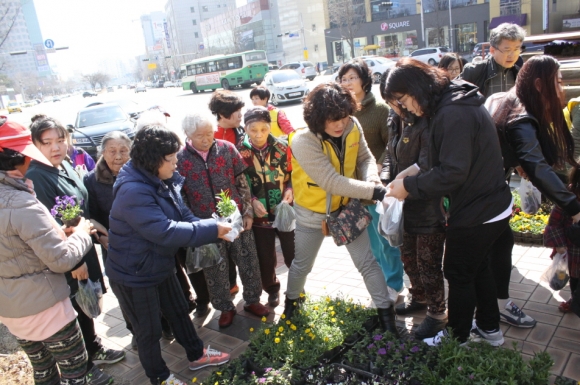 구미꽃예술협회(회장 홍태연)가 15일 구미시청과 구미교육지원청 사이 인도에서 시민들에게 꽃묘를 나눠주며 완연한 봄의 시작을 알렸다.