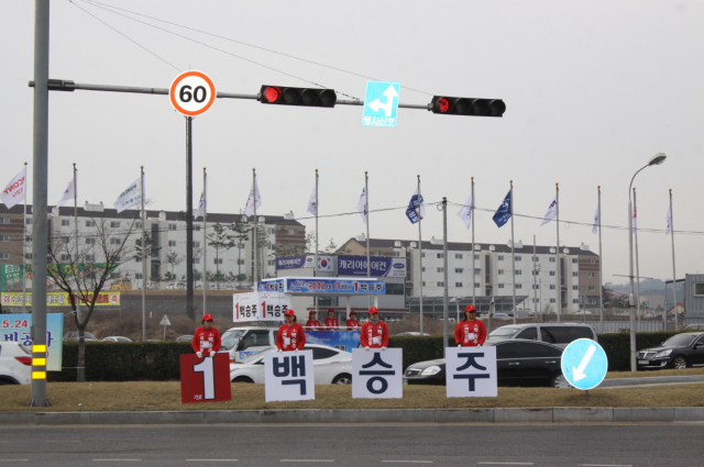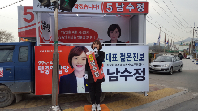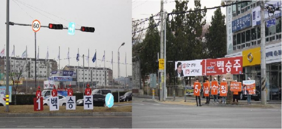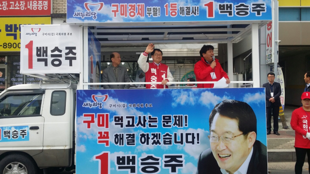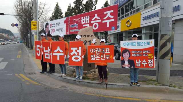구미갑 새누리당 백승주 후보와 민중연합 남수정 후보가 새로넷방송 오거리와 구미고 사거리에서 각각 아침 출근길 유권자들의 표심잡기에 나섰다.