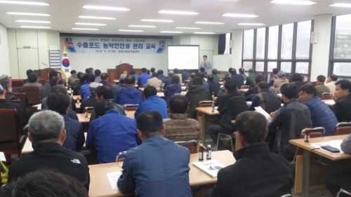 김천시가 수출국 맞춤형 포도의 안전생산 및 경쟁력 향상을 위해 21일 새김천농협 회의실에서 GAP거봉수출공선회 150명을 대상으로 수출포도 농약안전성 관리 교육을 실시했다.