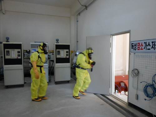 훈련에서는 살균 소독용 염소가스 유입배관 일부가 파손돼 독성가스가 누출 되는 가상의 시나리오를 통해 최초 사고신고 및 부상자 후송, 인근 주민대피 요령 등 초동 대응훈련과 안전사고 대응체계 전반에 대해 모의 훈련을 진행했다.