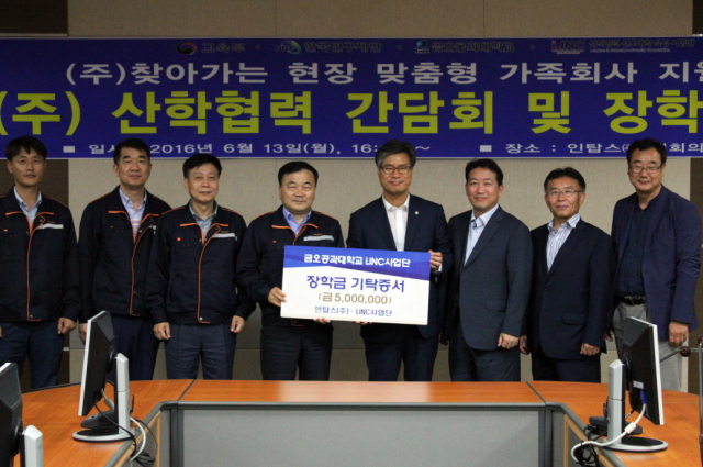 전달된 장학금은 금오공대 LINC사업단의 맞춤형 인재 양성을 위해 사용될 예정이다. 장학금 기탁식과 함께 열린 간담회에서는 산학연관 협력 활동 강화를 위한 다양한 의견을 나눴다.