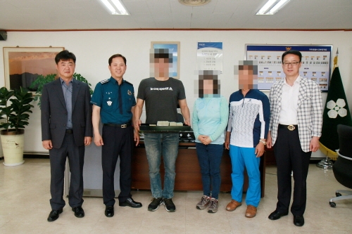 | ↑↑ 경찰은 7월1일, 서장실에서 회수한 2천800만원을 피해자에게 돌려주고 기념촬영을 했다. |