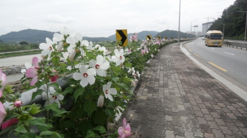무궁화 꽃모양의 다년생 화초인 부용화는 한번 심으면 매년 꽃대가 올라와 6월말부터 8월말까지 빨강, 분홍, 하얀색의 꽃을 피우는 가로변 식재에 적당한 꽃이다.
