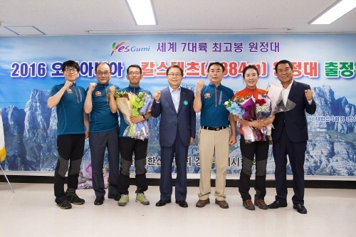 한편 구미시와 시 산악 연맹은 전국 기초자치단체 가운데 처음으로 ‘세계 7대륙 최고봉 원정계획’을 세워 지난 2012년 유럽-엘브루즈(5,642m), 2013년 아프리카-킬리만자로(5,895m), 2014년 북아메리카-맥킨리(6,194m), 2015년 아시아-에베레스트(8,848m), 2016년 남아메리카-아콩카구아(6,957m)에 이어 이번 오세아니아-칼스텐츠(4,884m)과 2017년 남극-빈슨메시프(4,897m), 2018년 에베레스트(8,848m) 정상 재도전을 끝으로 7년간 대장정의 막을 내린다.