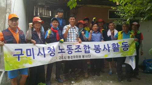 구미시청 환경미화원 봉사단(단장 어상훈)이 지난 달 29일 13명의 단원이 참여한 가운데 상모사곡동(동장 이성수) 기초수급자 1세대에 대한 집수리 봉사 활동을 펼쳤다.