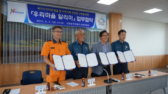 인동동(동장 이창형)이 5일 주민센터 2층 다목적강당에서 복지사각지대 발굴 및 지역사회안전망 구축을 위한 ‘우리마을 알리미’ 업무협약식을 가졌다.
