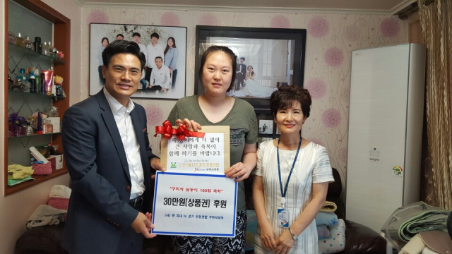 저출산의 심각성이 사회문제로 대두되고 있는 가운데 100일을 맞이한 세쌍둥이를 축하하는 의미로 한 자녀 더 갖기 연합가 상품권 30만원과 나무산후조리원이 신생아용 분유, 구미보건소가 육아용품 칫솔세트와 물티슈 등을 전달했다.