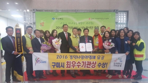 구미시가 27일 칠곡군 교육문화회관에서 열린 ‘2016 경북 사랑의열매 유공 포상식에서 경북사랑의 열매 유공,최우수 기관상 수상의 영예를 안았다.