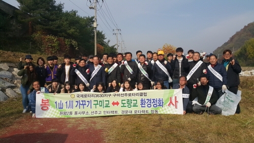구미시 원평2동(동장 곽흥재)이 12일, 1사1 하천운동 협약을 맺은 국제로타리 클럽 3630지구 구미선주 로타리클럽(회장 원종욱) 회원 20여명과 선주고, 경운대학교 자원봉사 학생 40여명 등 60여명이 참여한 가운데 하천정화활동을 펼쳤다.