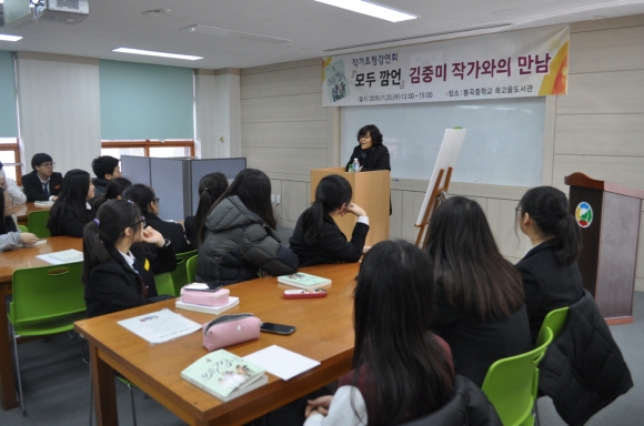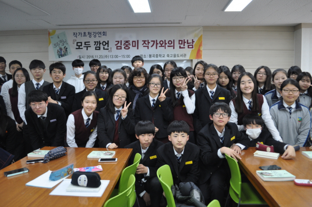 봉곡중학교(교장 안태표)가 23일 쑥고을도서관에서 올해 한 책 하나 구미운동에서 선정된 ‘모두깜언’의 김중미 작가를 초청해 강연회를 열었다.