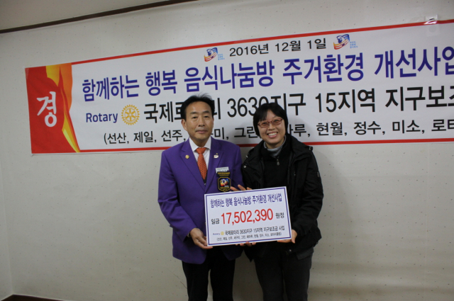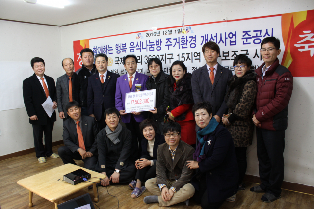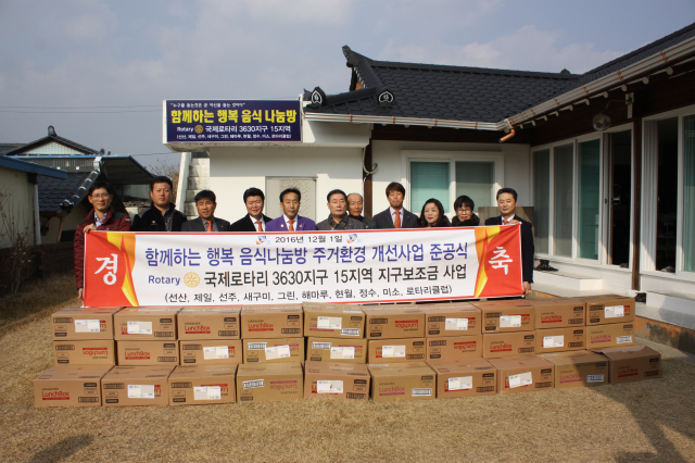15지역의 선산, 제일 선주, 새구미, 그린 해마루 현월, 정수, 미소로타리클럽은지난 8월 2016-17년 지구보조금사업을 해평 음식나눔방 환경개선으로 목표로 설정하고 1천750여만의 사업비로 노후화된 씽크대와 가스레인지 등의 교체와 수납장, 냉난방기 설치 등 환경개선 사업을 추진해왔다. 또 이날 준공식에서 식사배달과 밑반찬배달에 필요한 3단 찬합과 도시락가방도 기증했다.