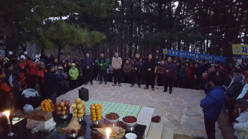 인동동(동장 이창형)천생산성 보존협의회(회장 장종길)가 1월 1일 오전7시 천생산성 정상에서 1천여명의 주민들이 함께한 가운데 해맞이 및 시민 안녕 기원제를 가졌다.