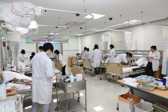 특성화 전문대학 육성사업의 일환으로 실시하고 있는 이번 캠프는 이달 18일까지 3주간 간호학과 3학년 232명을 대상으로 교내 샤인시뮬레이션센터(SHINE : School Hospital in Nursing Education) 내 기본간호실습실에서 진행된다.