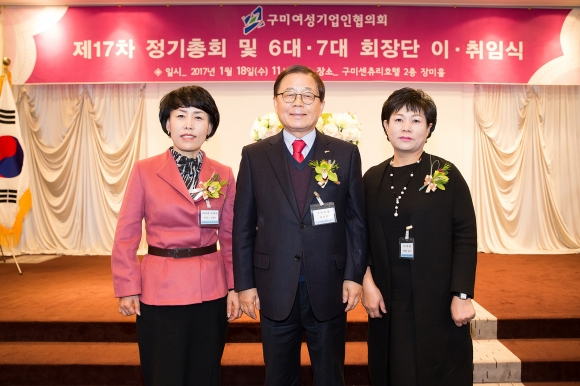 | ↑↑ 좌측 김경미 이임 회장 가운데 남유진 구미시장 우측 김묘라 신임 회장 |
