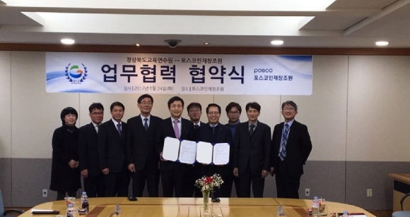 경상북도교육연수원(원장 문태수)이 앞서가는 연수, 변화하는 교육의 실현을 위해 세계 일류기업을 향한 글로벌 No.1 HRD솔루션을 지향하는 포스코인재창조원(혁신컨설팅센터장 최중권)과 공동사업 업무협약(MOU)을 체결했다.