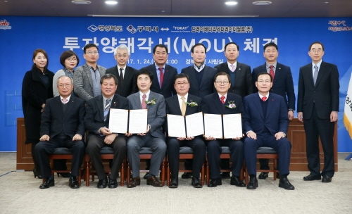 경상북도와 구미시가 24일 도청사림실에서 도레이 배터리 세퍼레이터필름(주)와 리튬이온 전지 분리막 증설 관련 투자양해 각서(MOU)를 체결했다. 체결식에는 남유진 구미시장,정병윤 경제부지사, 김익수 구미시의회 의장, 류 한규 구미상공회의소 회장,나카무라 테이지(中村悌二)도레이 배터리 세퍼레이터 필름한국 대표이사 등 20여명이 참석했다.