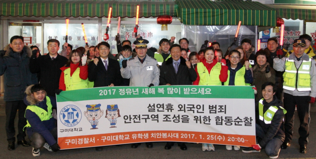 구미대학교(총장 정창주) ‘외국인 유학생 치안 봉사대’가 25일 저녁 설 연휴를 맞아 구미경찰서와 외국인 범죄예방 합동 순찰을 펼쳐 눈길을 끌었다.