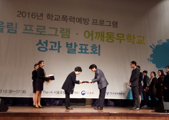 천생초등학교(교장 배인호)가 ‘2016학년도 학교폭력예방 선도학교 운영사례 공모전’에서 우수학교로 선정돼 3일 서울 K호텔에서 열린 시상식에서 교육개발원장상을 수상했다.