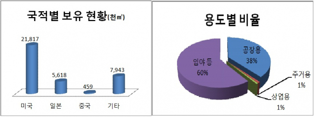 외국인이 보유한 토지 소유현황은 국적별로 미국이 21,817천㎡(60.1%)로 가장 많고, 일본 5,618천㎡(15.7%), 중국 459천㎡(1.3%), 기타 7,943천㎡(22.2%)이다.용도별로는 공장용지가 가장 많은 13,765천㎡(38.4%)를 차지하고 있으며 그 밖에 주거용 289천㎡(0.8%), 상업용 227천㎡(0.6%), 임야․농지 등 기타용지가 21,556천㎡(60.2)로 나타났다.