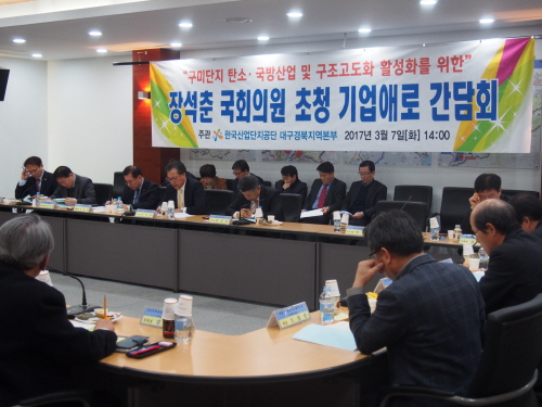 구미단지 탄소·국방산업과 구조고도화 활성화를 위한 '장석춘 국회의원 초청 기업애로 간담회'가 지난 7일 오후 한국산업단지공단 대구경북지역본부 컨퍼런스룸에서 열렸다.