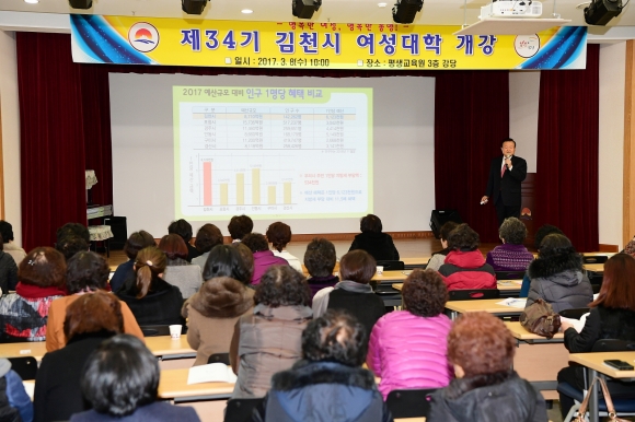 김천시가 8일 평생교육원 3층 강당에서 제34기 김천시 여성대학 개강식에 이어 첫 강의를 시작했다.