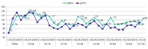 2/4분기 기업경기 전망치가 108를 기록하면서 8분기만에 기준치를 웃돌았다.