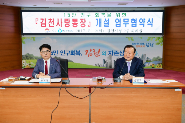 김천시와 MG 새마을금고(이사장 협의회장 엄태영)가 2일 시청에서 김천사랑통장 개설에 관한 업무협약을 맺은 가운데 15만 인구 회복운동 동참과 함께 지역발전을 위한 협력을 다짐했다.