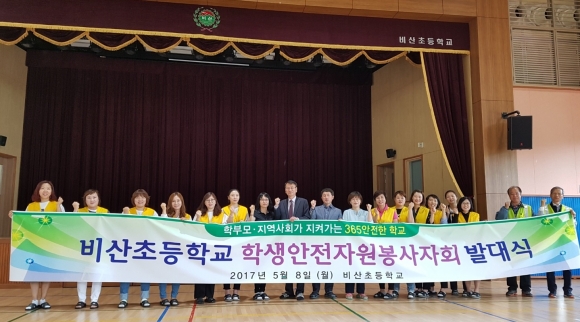 비산초등학교(교장 안승철)가 '365일 온종일 안전한 학교 만들기'를 위한 안전망 구축 일환으로 비산초 학생안전자원봉사자회를 조직하고 8일 꿈마루관에서 발대식을 가졌다.