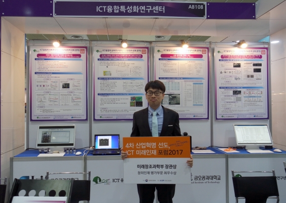 금오공과대학교 ICT융합특성화연구센터 이필호(32세·지도교수 장영찬) 연구원이 24일 서울 코엑스에서 열린 ‘ICT 미래인재포럼 2017’에서 미래창조부 장관상(최우수상)을 수상했다.