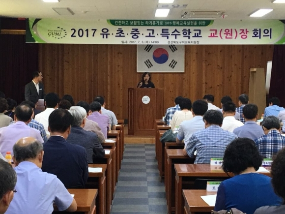 구미교육지원청이 6일 4층 대회의실에서 여름방학대비 안전하고 즐거운 학교 만들기를 위해 유·초·중·고·특수학교 교(원)장 총98명을 대상으로 학교장 회의를 가졌다.