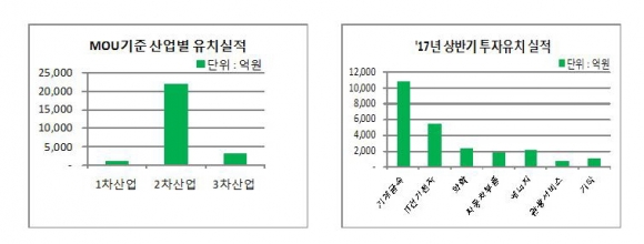 올해 상반기 MOU를 체결한 39개사의 투자유치 현황을 보면 1차 산업이 6개사 293억원, 2차 산업이 30개사 2조 1천972억원, 3차 산업이 3개사 2천110억원으로 제조업 비중이 90.1%를 차지해 투자유치 목적에도 부합하고 있다.