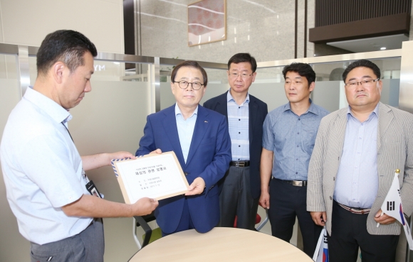| ↑↑ 남유진 시장 1인 피켓시위를 마친후 우정사업본부 측에 성명서를 전달하고 있다 |