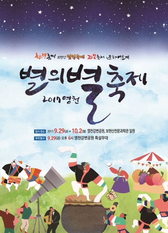 오는 9월 29일부터 10월 2일까지 영천강변공원 일원에서 영천한약·과일 축제, 문화예술제가 열리고, 보현산천문과학관 일원에서는 보현산별빛축제등 4개 축제를 통합한 ‘2017 영천 별의별축제’가 열린다.