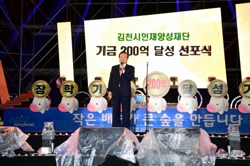 김천시 인재양성재단(이사장 박보생)이 지난 12일 종합스포츠타운 주차장 특설무대에서 인재양성재단 기금 200억 달성 선포식을 가졌다.